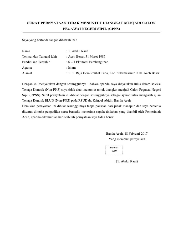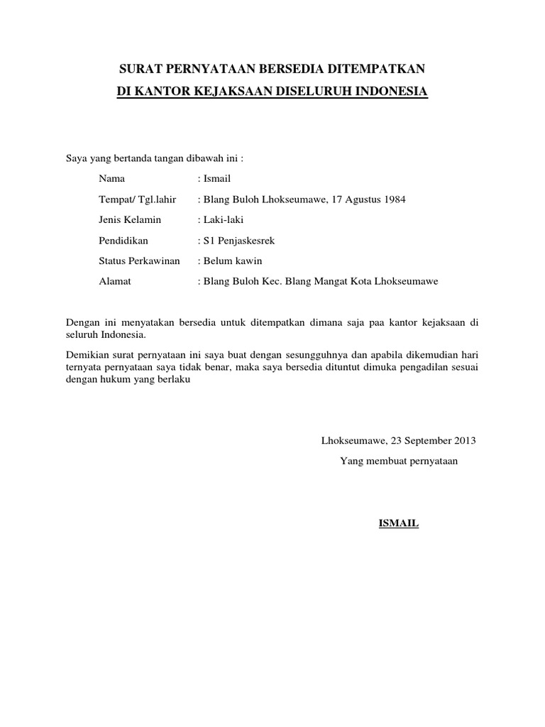 Kotabumi/14 juni 2000 asal polres/ta : Surat ini biasanya berisi beberapa hal yang mencakup kesanggupan berkaitan dengan bekerja lembur, bersedia dikontrak selama beberapa waktu. Surat pernyataan cpns 2018 adalah salah satu berkas wajib diupload pada proses penyeleksian cpns 2018 di situs bebas dari penggunaan obat obatan. Karena sejatinya para pns adalah abdi negara yang siap melayani masyarakat indonesia. Nah itulah tadi contoh surat pernyataan bersedia ditempatkan dimana saja di satuan kerja kementerian agama tahun 2018 yang bisa saya bagikan untuk anda.